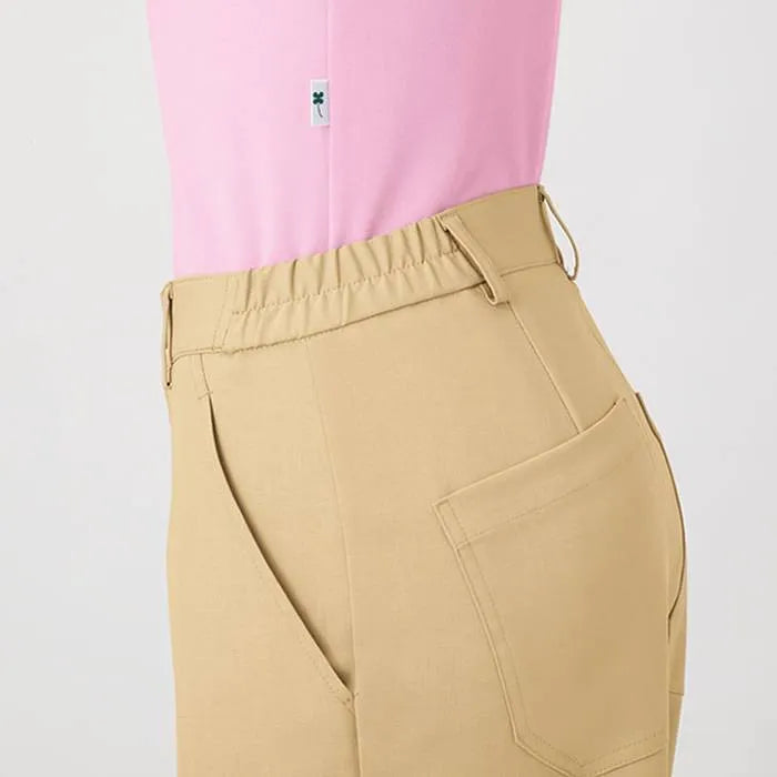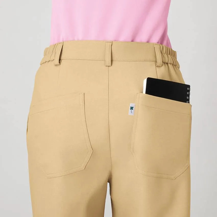 しゃがむ動きをサポートしたアクションパンツで、しゃがむ時、膝〜太もも〜股にストレスなく、後ろウエストのチラ見えもカバーし、脇ゴム仕様でウエストの締め付けも軽減。